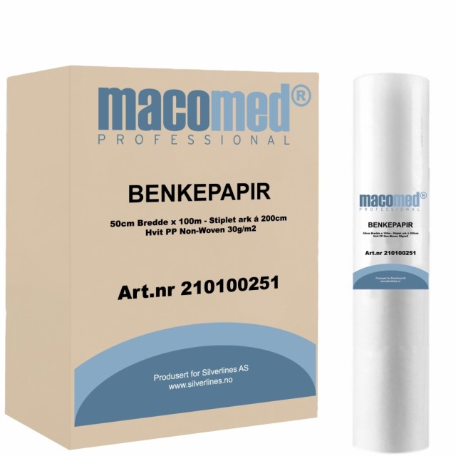 Benkepapir Mykt 50x200cm, 30gsm (100m) Antall: 6 Macomed benkepapir, 50 ark pr rull, a 50x200cm (rullen er ferdig "stiplet" for hver 200cm, slik at hver lengde enkelt rives av) Les mer