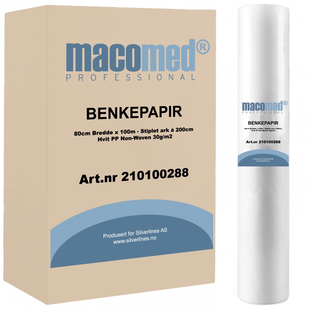 Benkepapir Mykt 80x200cm, 30gsm (100m) Antall: 6 Macomed benkepapir, 50 ark pr rull, a 80x200cm (rullen er ferdig "stiplet" for hver 200cm, slik at hver lengde enkelt rives av) Les mer