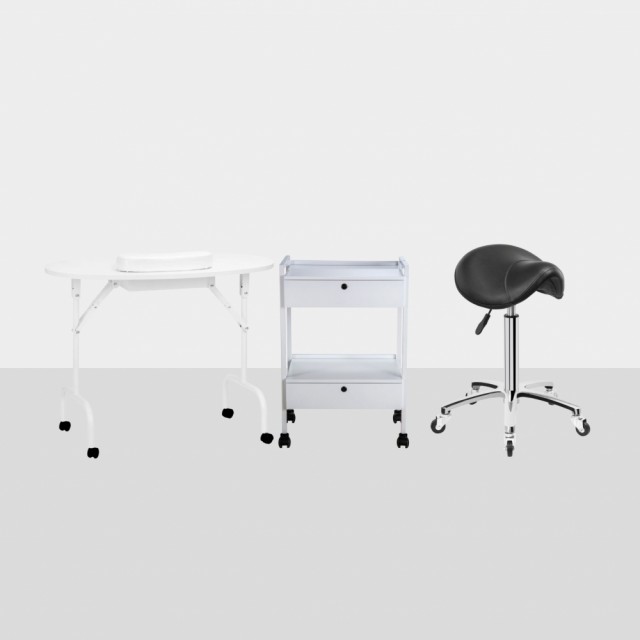 Manikyrbord PLEX, Sammenleggbart Antall: 1 Sammenleggbart manikyrbord med 3 skuffer. Skuffedelen er utstyrt med hjul, slik at det enkelt kan flyttes på når det er sammenslått. Les mer