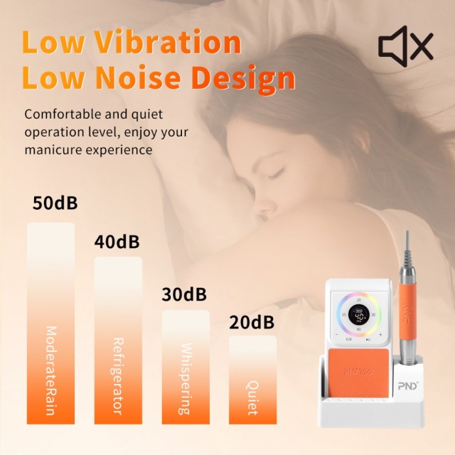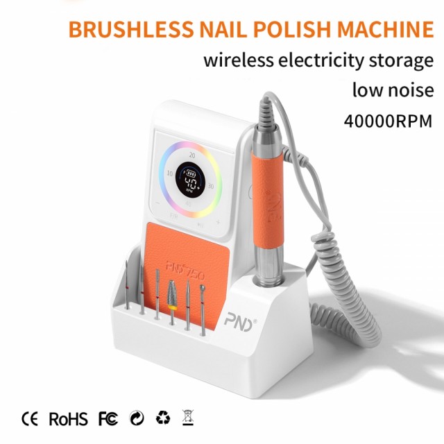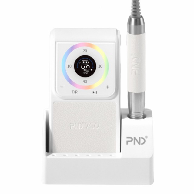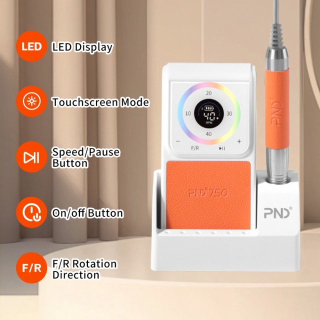 Oppladbar Slipemaskin (elektrisk neglefil) med touch LED display, og handstykke med anti overopphetingssytem, lavt lydnivå, lav vibrasjon, ergonomisk form og twist-lock system (passer alle standard bits). Børsteløs motor gjør håndstykket stabilt og holdbart, og lett aluminium holder vekten nede. Maskinen har brukstid på hele 8-10t, og kort ladetid på ca 2,5-3t.