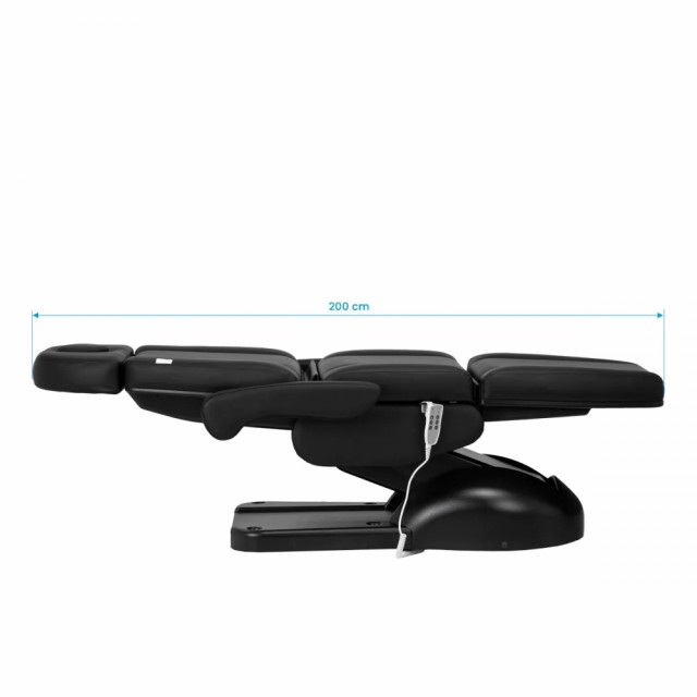 Praktisk kontroll med en kablet fjernkontroll muliggjør presis justering av stolen i tre plan: høydejustering, ryggstøttevinkel og fotstøtteinnstilling. Dette justeringsområdet gjør det mulig å skreddersy posisjonen til typen behandling som utføres – både med tanke på klientkomfort og spesialisert ergonomi. For enkel bruk kan fjernkontrollen festes til håndtak på begge sider av setet. Setehøyden er justerbar fra 65 cm til 84 cm, slik at posisjonen komfortabelt kan justeres til høyden på både klienten og behandleren. Når stolen er helt utstrakt, når den en lengde på over 2 meter, noe som gir komfortabel støtte for kroppen – selv under behandlinger som krever liggende stilling. Takket være slike parametere er utstyret egnet for en rekke behandlinger, både pleie- og spesialbehandlinger, noe som garanterer ergonomisk arbeid og høy servicestandard. Det brede setet sikrer komfort selv under lange behandlinger. De lett avtakbare og bevegelige armlenene, som kan roteres 180°, gjør det enkelt for klienten å sitte på stolen og gir uhindret tilgang for behandleren. Stolen har også en justerbar nakkestøtte, som garanterer stabil hodestøtte og ekstra komfort, spesielt for høyere klienter. Stolen er ideell for kosmetiske og skjønnhetsbehandlinger, samt for fysioterapi eller tatoveringsstudioer. Den uttrekkbare nakkestøtten gjør at stolen kan justeres til klientens høyde, noe som gir stabil støtte for hodet under behandlinger. Muligheten til å folde ut stolen til en lenestolposisjon utvider bruksområdet betydelig. En annen fordel er hullet i nakkestøtten, diskret skjult med en hette, noe som øker komforten når man ligger nede - spesielt under ryggbehandlinger. Gjennomtenkte designløsninger oversettes til brukerkomfort og spesialisert ergonomi. Stolens robuste konstruksjon sikrer stabilitet og holdbarhet under daglig bruk. Setet er fylt med skum med passende valgt hardhet for å garantere komfort selv under langvarige behandlinger. Trekket i behagelig imitert skinn i svarte nyanser gir hele stolen et profesjonelt utseende, samtidig som det er fuktbestandig og lett å rengjøre. Den slitesterke basen garanterer stabilitet, mens de nøye konturerte kantene fremhever møbelets moderne karakter og forbedrer setets ergonomi. Detaljerte mål på lenestolen er gitt på bildet. Settet inkluderer: fjernkontroll, strømforsyning, nakkestøtte.