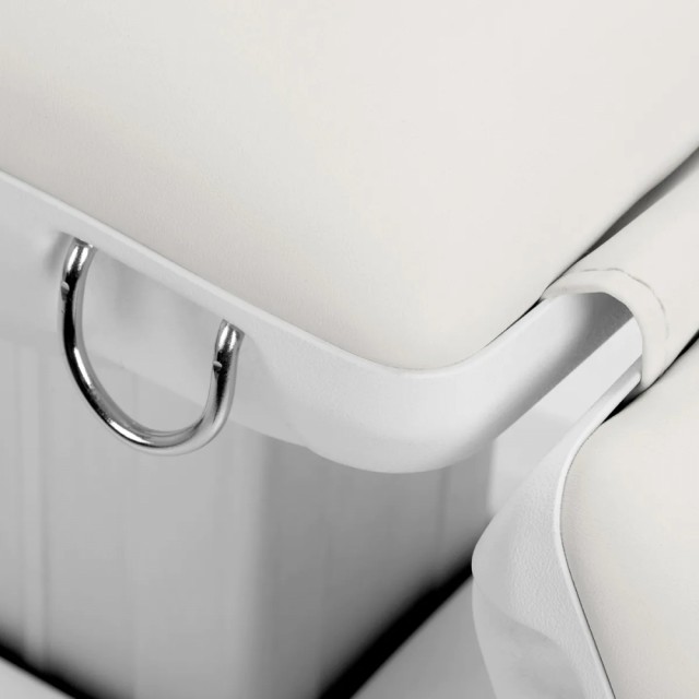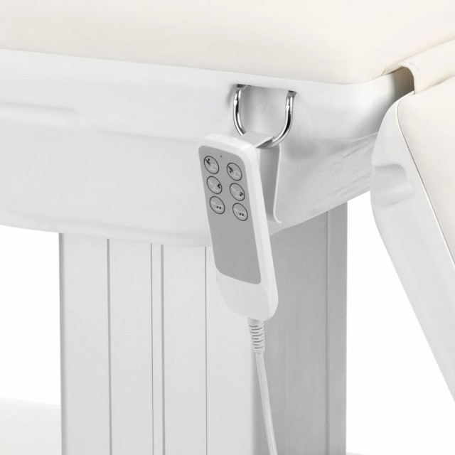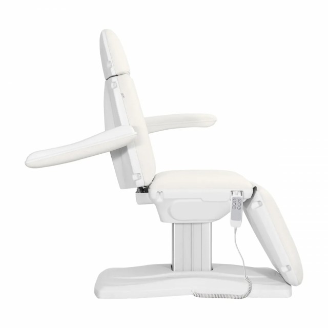 En intuitiv fjernkontroll lar deg justere stolen i 3 plan - høyde, ryggstøtte og fotstøttevinkel. Dette gjør at stolen kan justeres jevnt til en komfortabel tilbakelent stilling, slik at ansikt og kroppsbehandlinger kan utføres. Setehøyden er justerbar fra 60cm til 80cm og fjernkontrollen kan henges på begge fester på hver side av stolen. Nakkestøtten kan forlenges med 20cm og gjør at stolen kan justeres til brukes høyde i tillegg til å sikre stabil støtte for hodet under behandlinger, og armlenene kan roteres 180* og fjernes ved behov. Den stabile og solide basen garanterer ikke bare stolens holdbarhet, men også sikkehet og komfort under daglig arbeid. Stolen er fylt med skum og trukket med intimt skinn i en elegant hvit farge. Dette materialet er behagelig å ta på, motstandsdyktig mot fuktighet og lett å holde rent.
