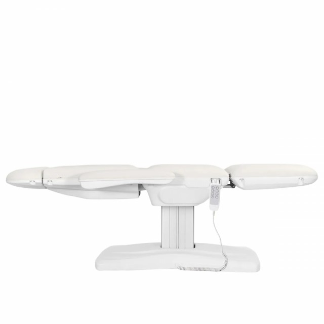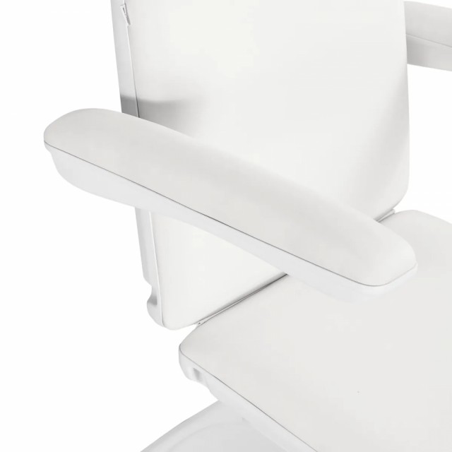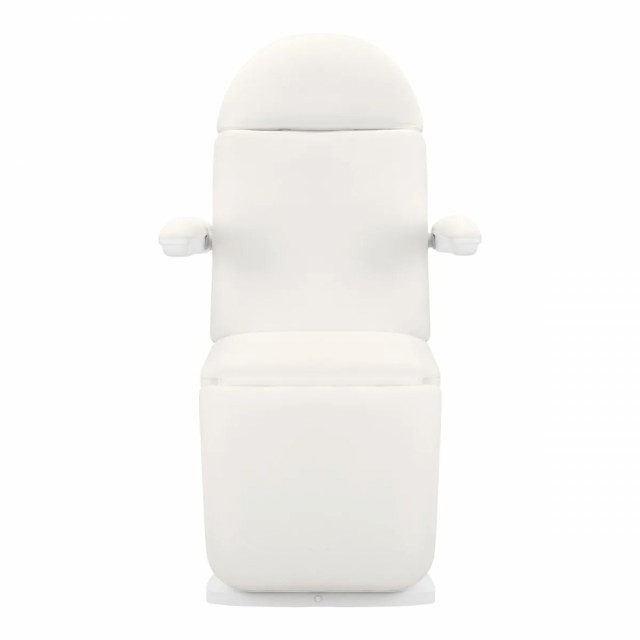 Stolen kjennetegnes av sin enkle, moderne form og er egnet for profesjonelle skjønnhetssalonger. En intuitiv fjernkontroll lar deg justere stolen i fire plan - høyde, ryggstøtte, fotstøttevinkel og vugge. Dette gjør at stolen kan justeres jevnt til en komfortabel tilbakelent stilling, slik at både ansikt og kroppsbehandlinger kan utføres komfortabelt på stolen. Setehøyden er justerbar fra 60cm til 80cm. For ekstra bekvemmelighet kan fjernkontrollen henges på håndtakene på hver sin side av setet, noe som gjør den enkel å oppbevare og holde styr på. Nakkestøtten kan forlenges med 20cm og gjør at stolen kan tilpasses brukers høyde og gir stabil støtte for hodet under behandlinger og de bevegelige armlenene kan justeres 180*, samt at de kan fjernes ved behov. Den stabile basen garanterer ikke bare stolens holdbarhet, men også sikkerhet og komfort under daglig arbeid. Stolen er fylt med skum og er trukket med et imitert skinn i en elegant hvit farge - dette materialet er behagelig å ta på, motstandsdyktig mot fuktighet og enkelt å renholde.