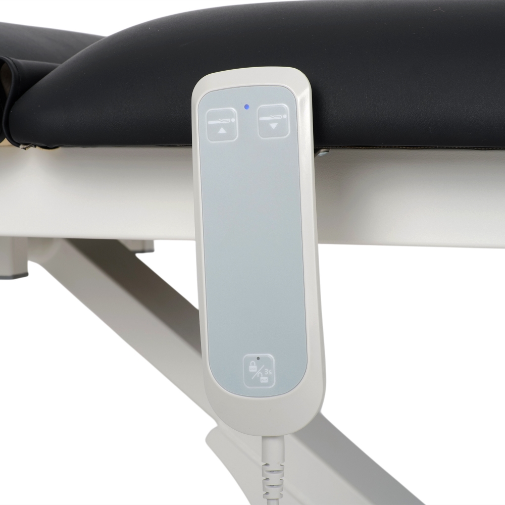 Elektrisk høydejustering: Optima-benken er utstyrt med en stillegående, sertifisert elektrisk aktuator som muliggjør presis høydejustering fra 49 cm til 86 cm, noe som sikrer komfortable arbeidsforhold for terapeuten og maksimal komfort for pasienten.