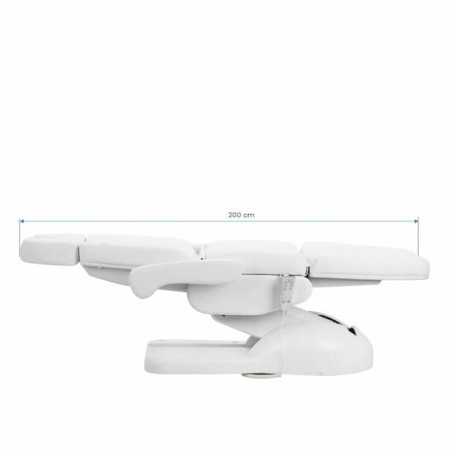 Merket Azurro tilbyr kosmetiske stoler og behandlingsbenker av høy kvalitet. Disse profesjonelle apparatene brukes i blant annet skjønnhetssalonger, fotpleie salonger, massasjestudioer ol. Produktet kommer med 3 aktuatorer styrt via kablet system, som sikrer presis og feilfri justering av de enkelte delene på stolen. Stolen er utstyrt med oppvarmingsfunksjon for ryggstøtten og setet - som bidrar til avslapning av muskler og komfort. Den utmerker seg med høy stabilitet samtidig som den har et bredt utvalg av justeringer, som sikrer komfortabel stoltilpasning for både klienten og behandleren. Den kablede fjernkontrolleen kan justeres i 3 plan: høyde, ryggvinkel og fotstøtte. Setethøyden er justerbar fra 60cm til 90cm og når den er helt tilbakelent har stolen en lengde på 2 meter. Setet er komfortabelt og armlenene er avtakbare, med en rotasjonsgrad på 180°. Utstyrt med en justerbar og avtakbar nakkestøtte, vil den bidra til å sikre stabil støtte for hodet. Trekket er av høykvalitets, behagelig syntetisk skinn i hvite nyanser. Dette gir et profesjonelt utseende, samtidlig som det er fuktbestandig og lett å vedlikeholde.