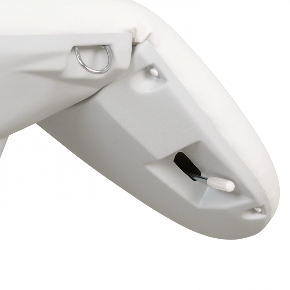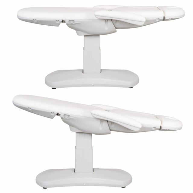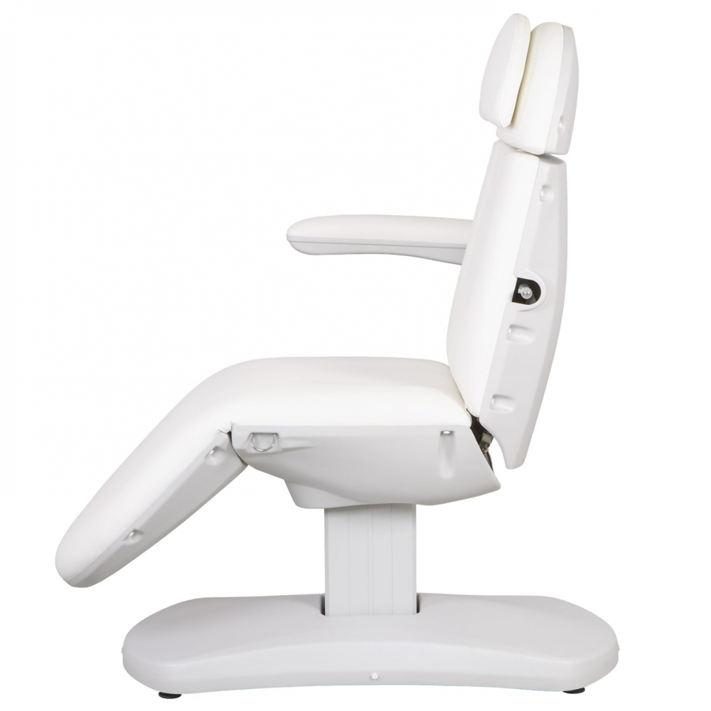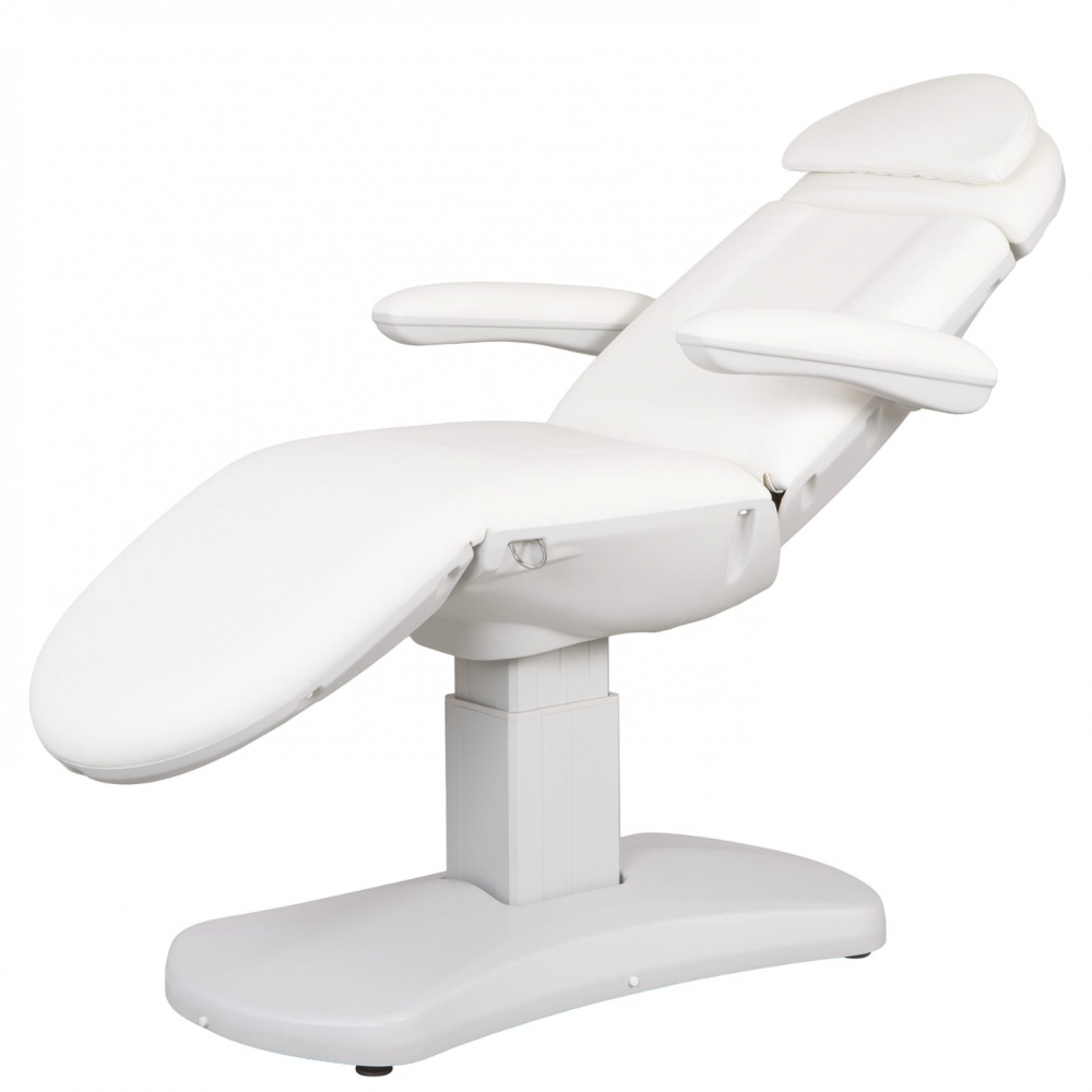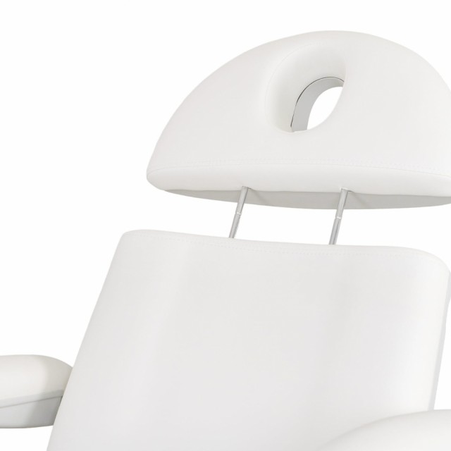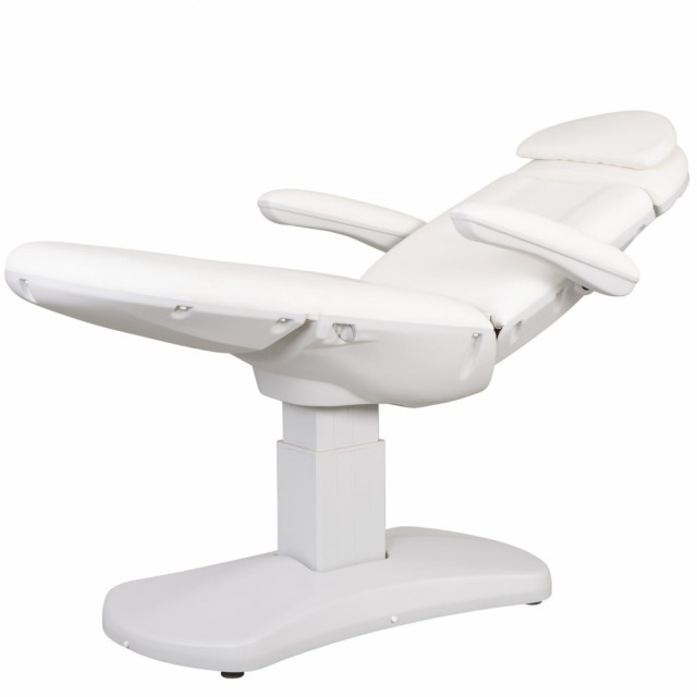 Eksklusiv behandlingsseng med minimalistisk stil og god komfort. Utstyrt med 3 motorer for justering av høyde, ryggstøtte og setevinkel. Fotstøtten kan justeres med gassstempel. Sammenleggbare armlener. Hvitt sømløst PU-trekk av høy kvalitet som er lett å rengjøre. Inkluderer fjernkontroll.