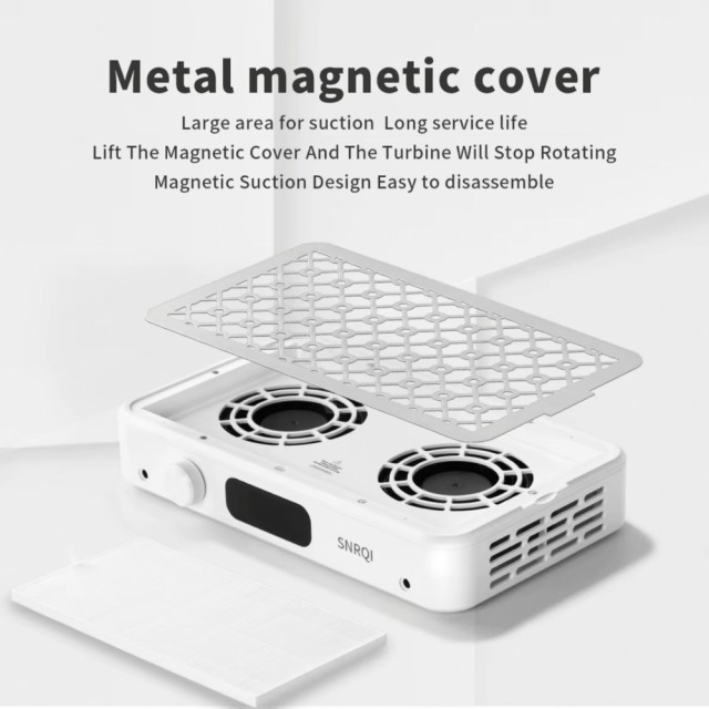 Neglevifte med stor overflate og 2 børsteløse vifter på 3500rmp pr vifte -totalt 7 000rpm innsug. Viften har 5 hastighets innstillinger som enkelt justeres ved å vri på knappen i fronten, og vises i det digitale displayet. Gitteret er festet med magneter, noe som gjør det enkelt å ta av og på for å rengjøre eller bytte filter. Frostet overflate-teknologi og beskyttende utluftningssystem gjør viften driftsikker, og motvirker overoppheting.  Viften har høydensitivt kassettfilter, noe som er mye bedre enn feks. pose -da støvopptaket er bedre, og løsningen er mer kosnadsbesparende.