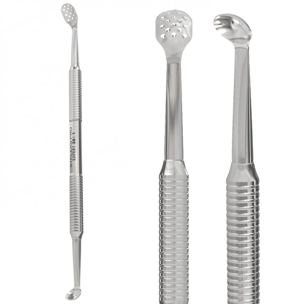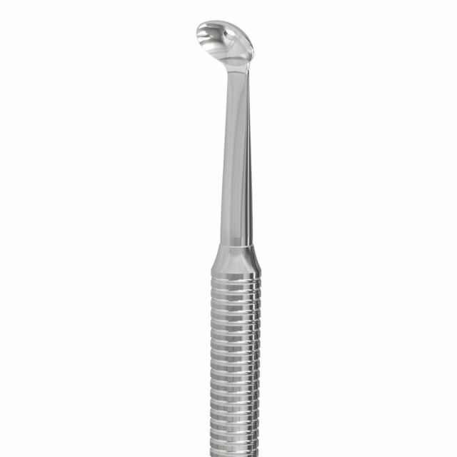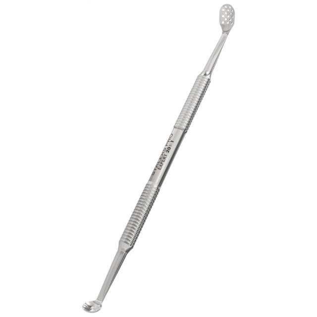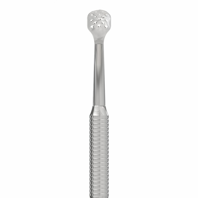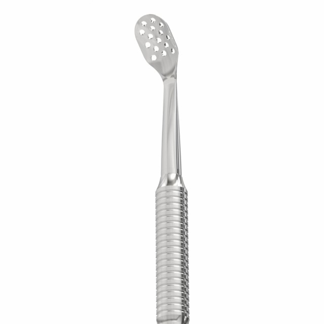 Beregnet for mekanisk hudpleie; forlenget perforert UNO-skje, klassisk hullstørrelse.Glatte polerte kanter reduserer risikoen for hudskader. Sklisisikret håndtak for godt grep, og ekstra korrosjonsbestandighet på grunn av polering med GOI slipepasta. AISI 420 rustfritt stål