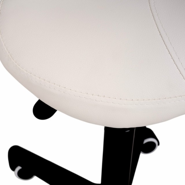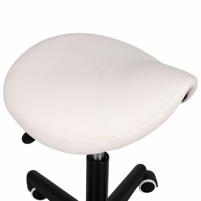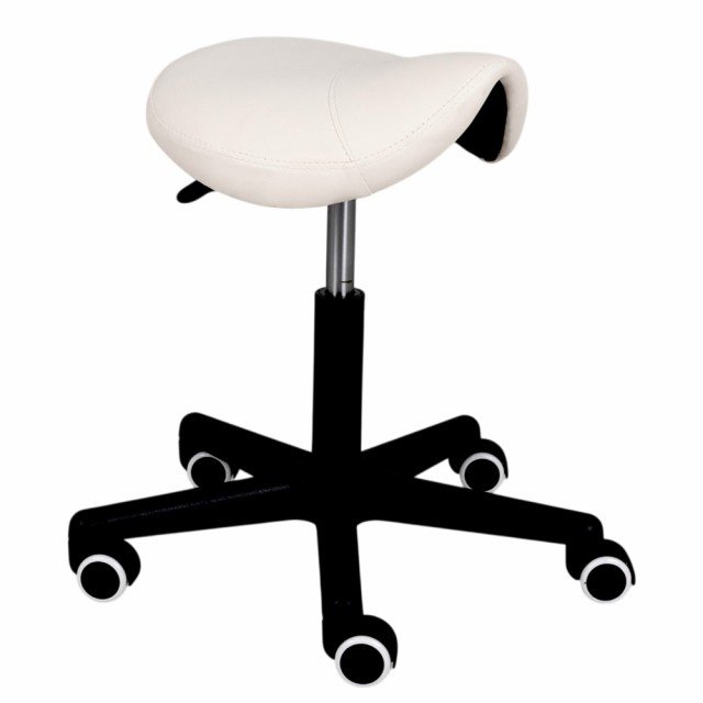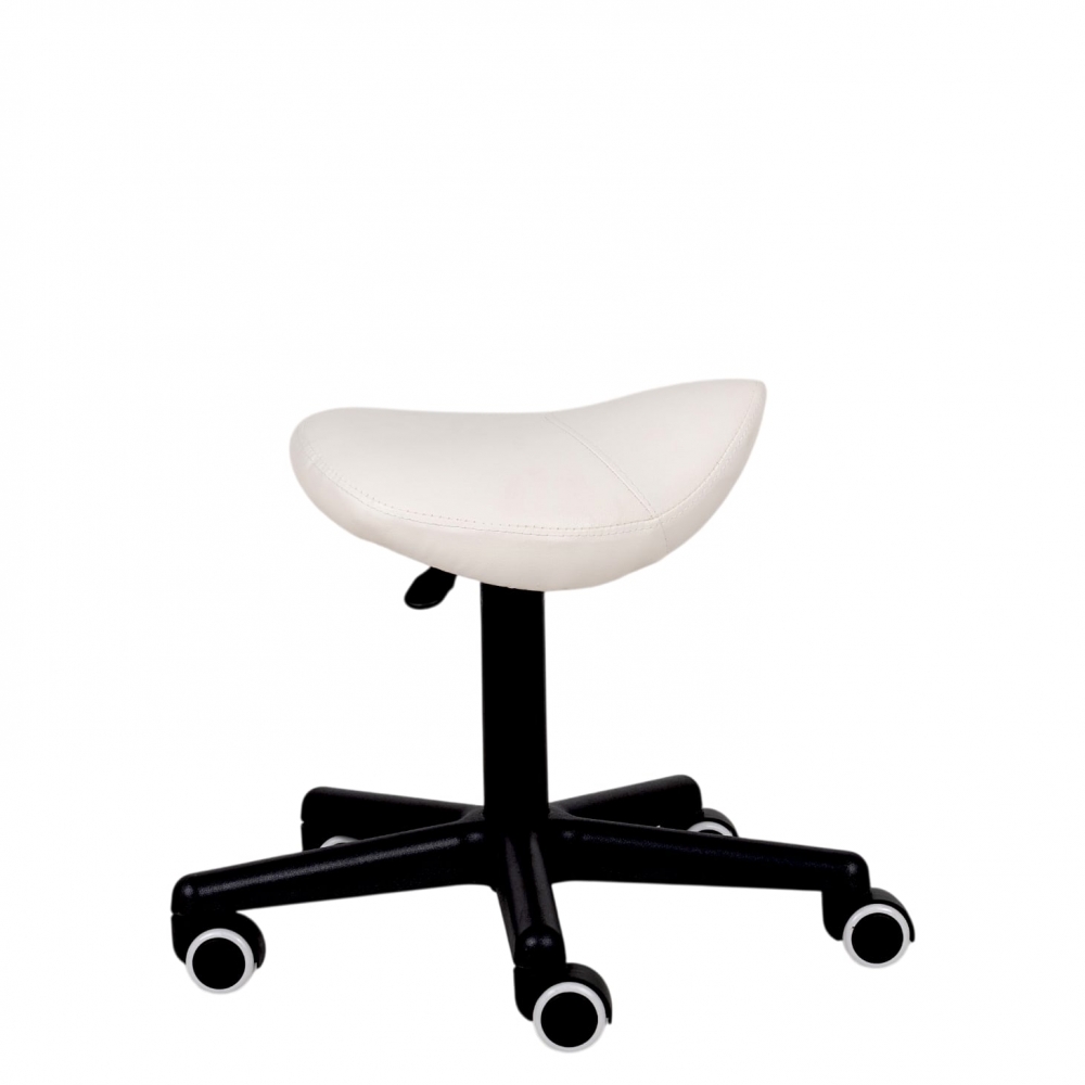 En ergonomisk svingbar stol med et profilert sete i form av en sal, praktisk høydejustering ved hjelp av en gassfjær, og en sort base med hjul. Sadelstolen støtter optimal fordeling av kroppsvekten og gjør det lettere å innta en naturlig og komfortabel sittestilling. Dedikert til massasjesalonger, fysioterapi, skjønnhetssalonger og frisører.