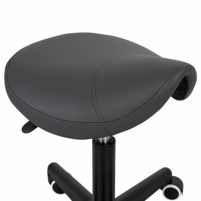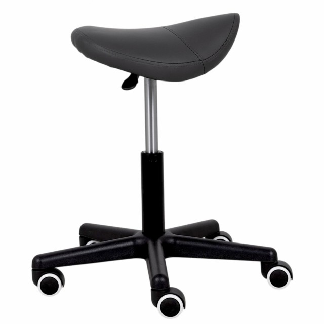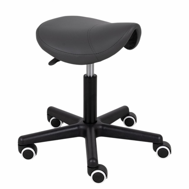 En ergonomisk svingbar stol med et profilert sete i form av en sal, praktisk høydejustering ved hjelp av en gassfjær, og en sort base med hjul. Sadelstolen støtter optimal fordeling av kroppsvekten og gjør det lettere å innta en naturlig og komfortabel sittestilling. Dedikert til massasjesalonger, fysioterapi, skjønnhetssalonger og frisører.