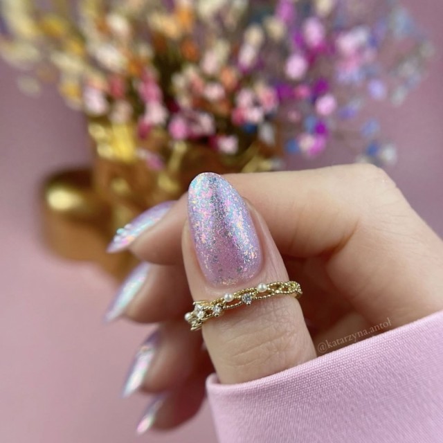Unicorn Glow 01: En subtil, semi-transparent blå som skimrer med iriserende rosa-gullpartikler. Takket være den delikate fargebasen og flerdimensjonale refleksjoner ser neglene ut som om de er dekket med glitrende støv. Et perfekt valg for de som elsker subtile, men effektive finisher.