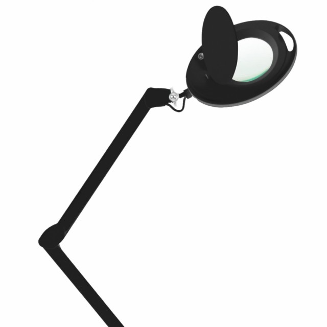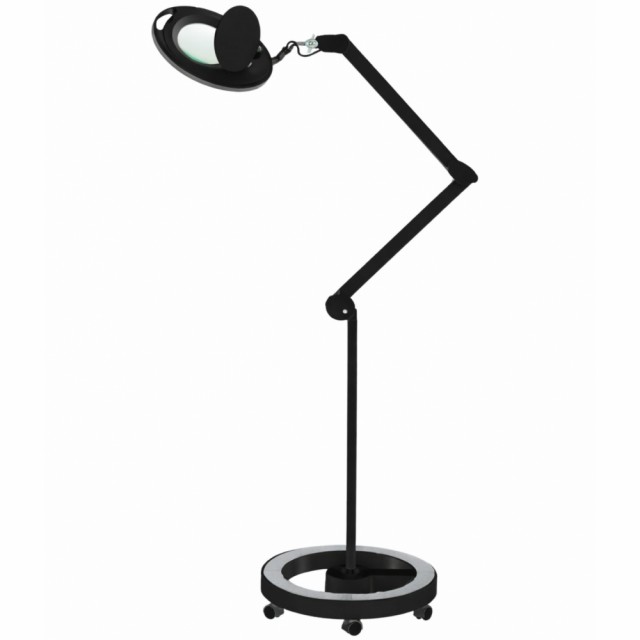 "Kaldtlys" LED-lampe med 5x forstørrelseslinse, ideell for presisjonsarbeid innen estetikk og velvære. Utstyrt med en leddarm for fleksibel og presis håndtering, en klemme for sikkert feste til bord eller skjønnhetsvogner, og en kompakt base med 5 hjul som sikrer maksimal stabilitet og mobilitet